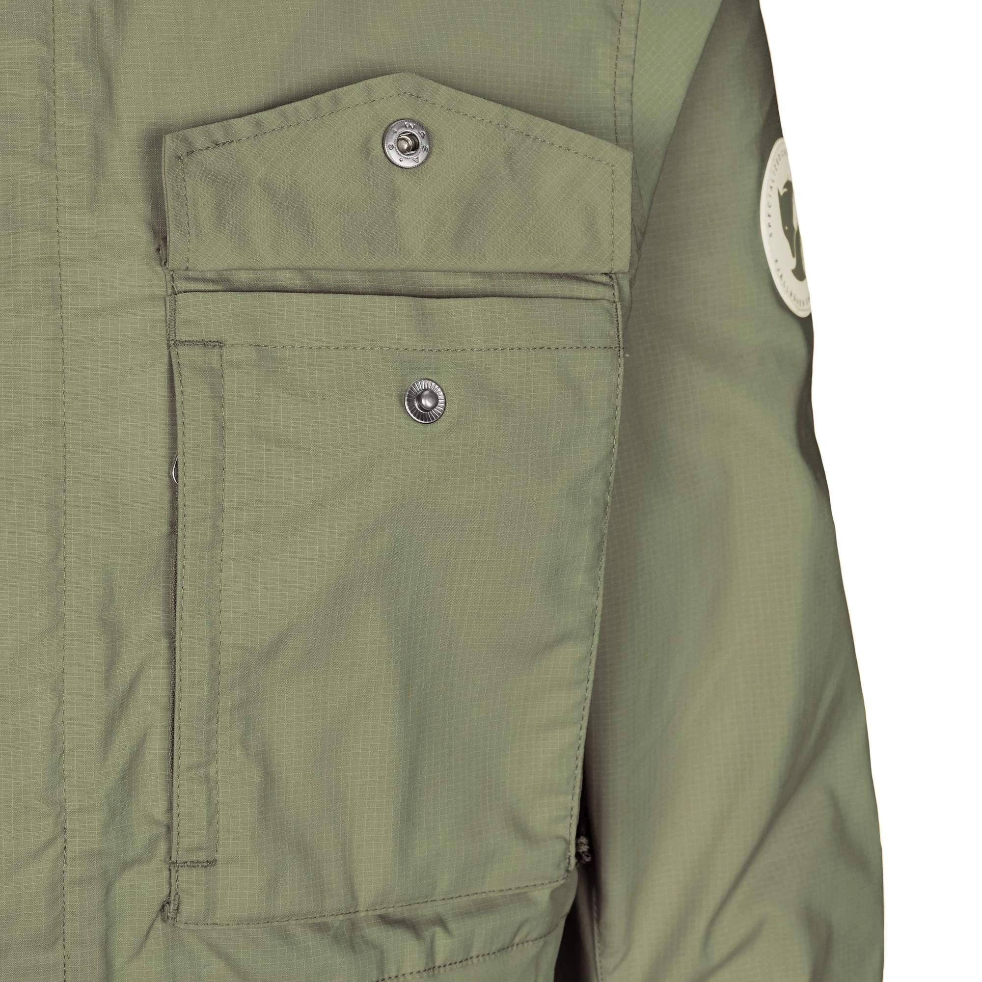 - Zwei große Brusttaschen mit Patte und Druckknopf